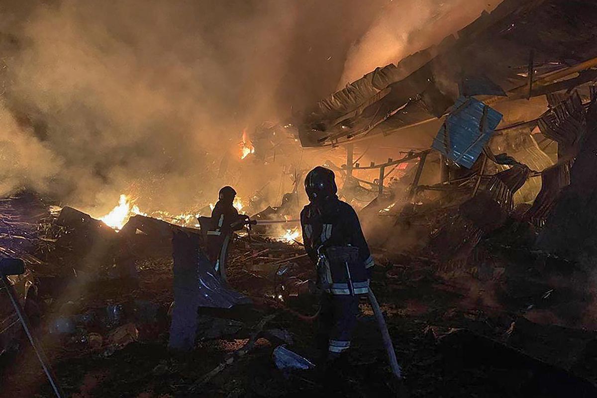 Dos rescatistas apagan el incendio en un supermercado en Ucrania, luego de bombardeos rusos.