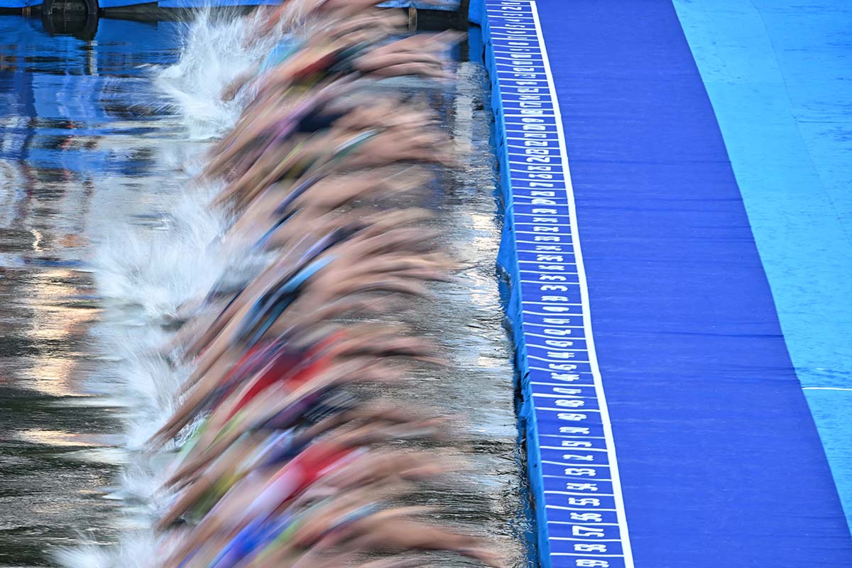 Nadadoras se tiran a una pileta durante el comienzo de las pruebas de triatlón de los próximos Juegos olímpicos a desarrollarse en París.