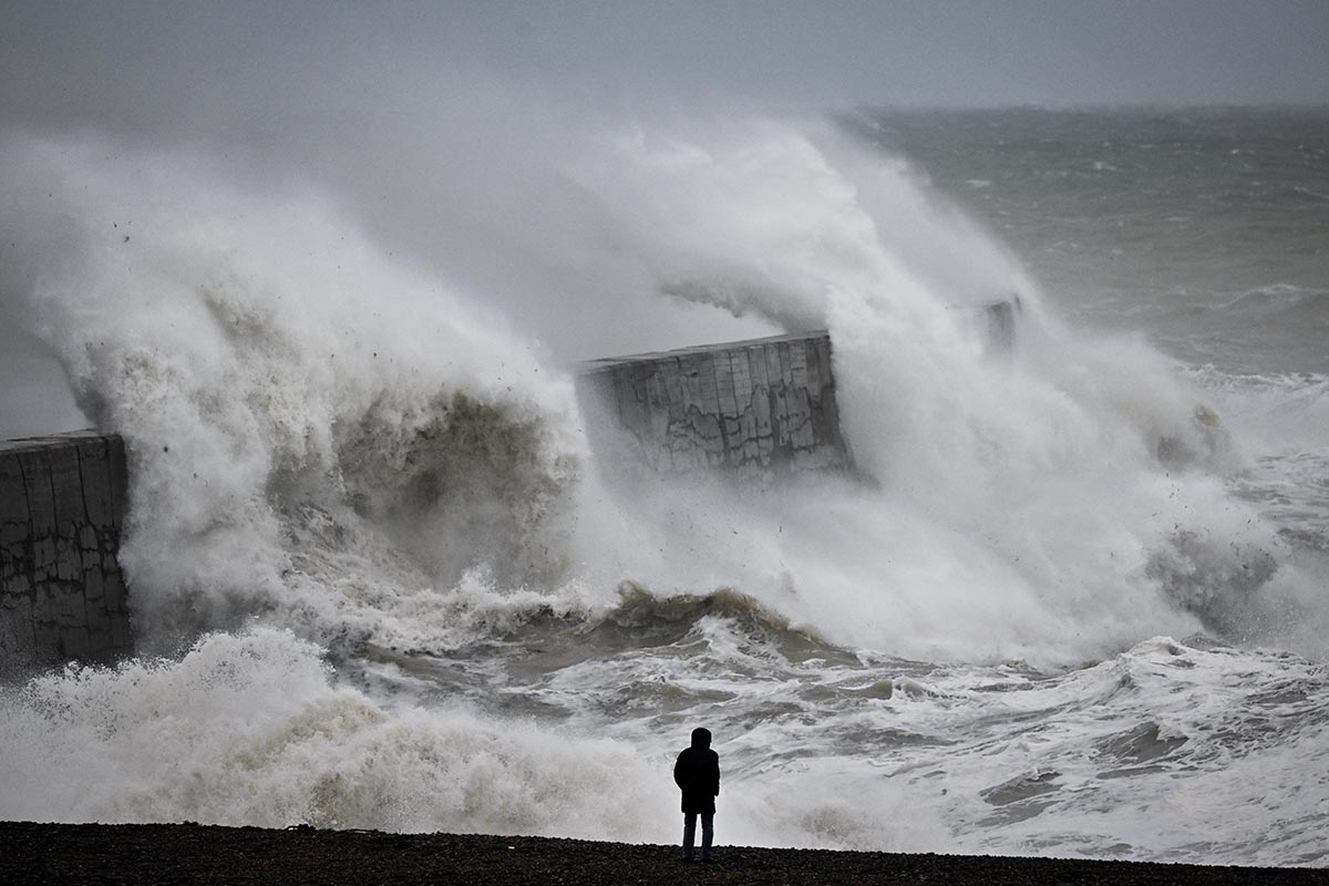 Un ho,mbre mira las olas golperar el muelle en Newhaven, Inglaterra durante el paso de la tormenta Ciaran.