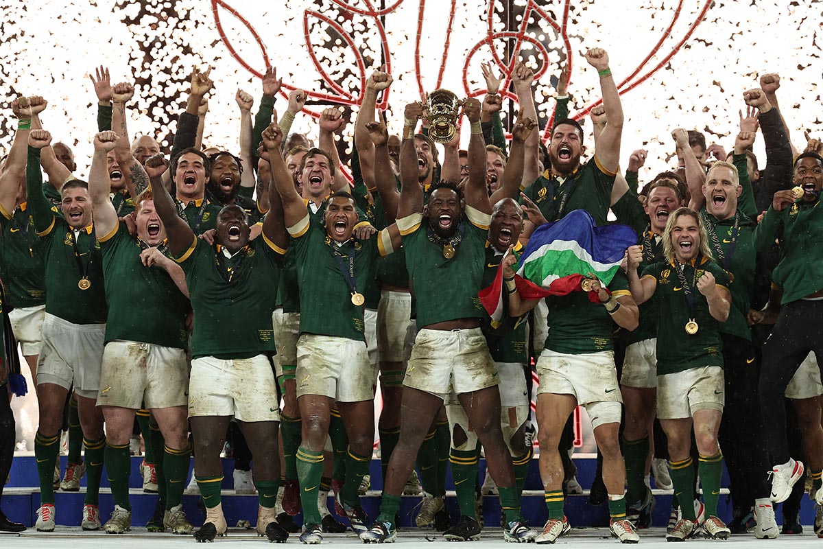 El equipo de Sudáfrica festeja la obtención del Campeonato Mundial de Rugby disputado en Francia.