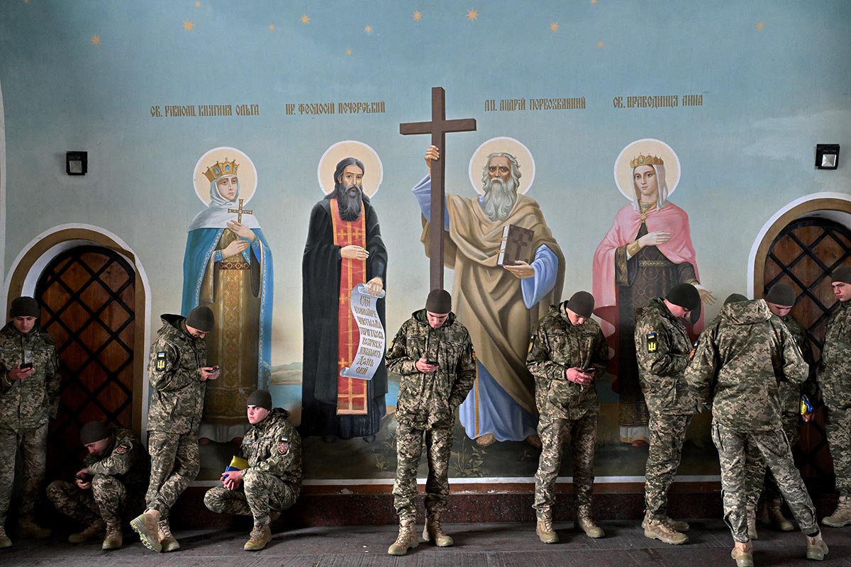 Soldados ucranianos se refugian de la lluvia en una iglesia.