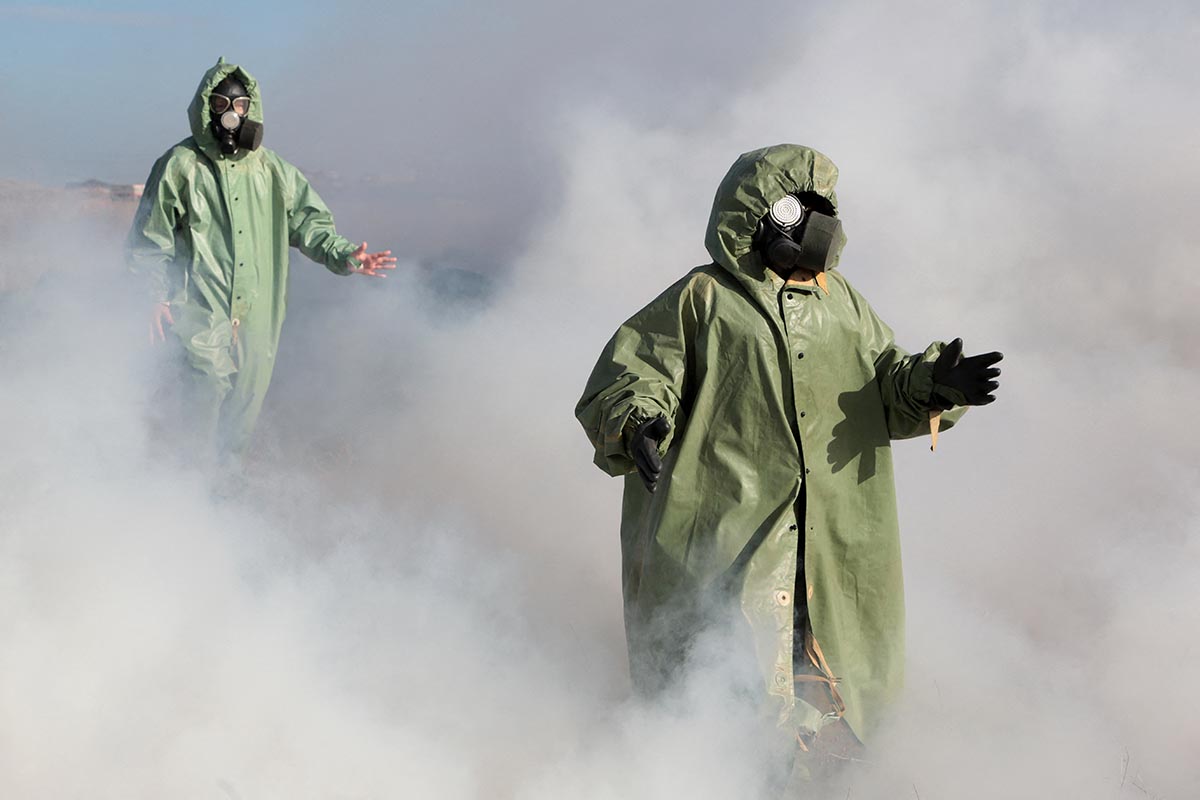 Un niño en etapa escolar ucraniano, vestido con máscara antigas y traje, realiza ejercicios durante el programa "Escuela de futuros comandantes".