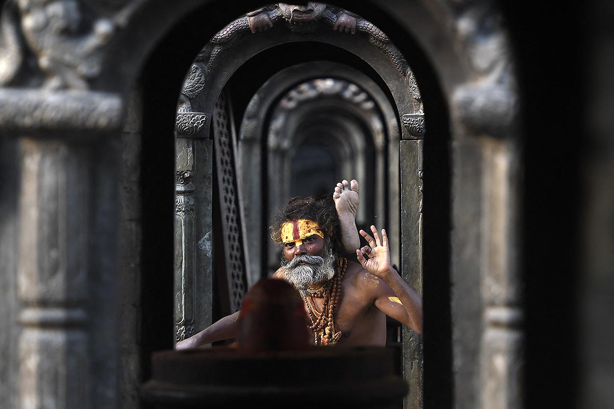 Un hombre santo posa para el fotógrafo en un templo en Nepal.