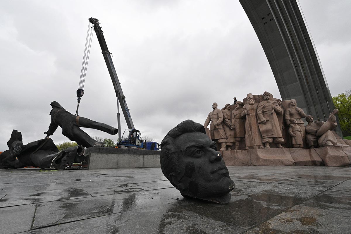 El monumento a la amistad rusa-ucraniana es desmantelado en la ciudad de Kyiv.