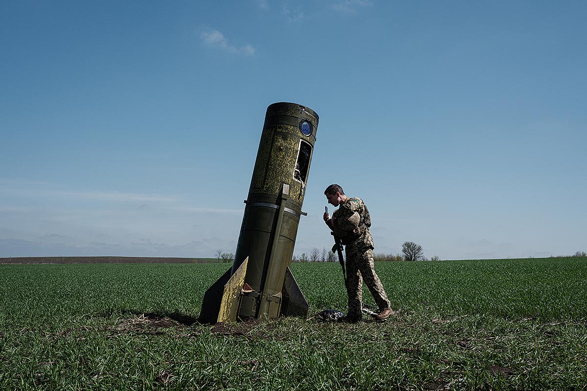 Un soldado ucraniano observa una parte de un misil incrustado en la tierra.