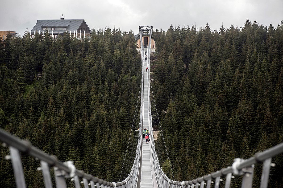 Turistas caminan a través del puente colgante más largo del mundo, en la República Checa.