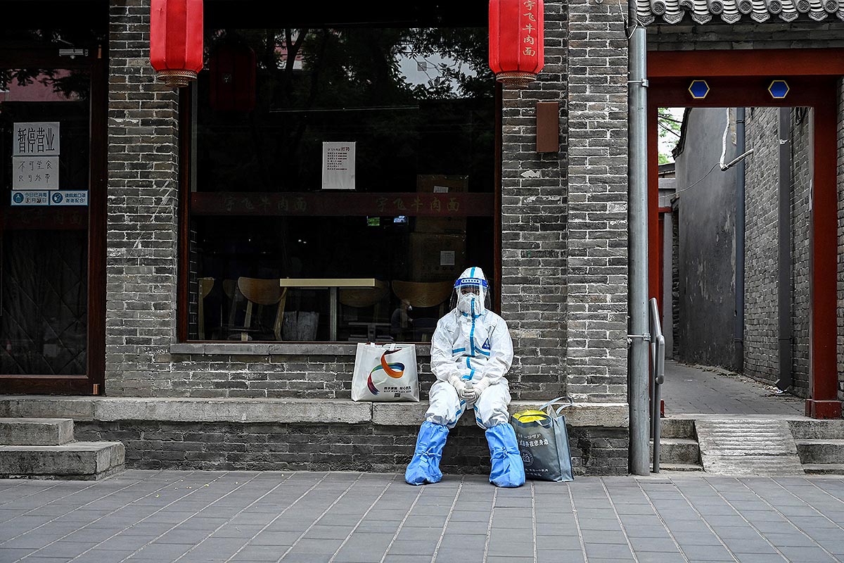 Un trabajador de la salud descansa frente a un restaurant cerrado por una nueva cuarentena en la ciudad de Beijing.