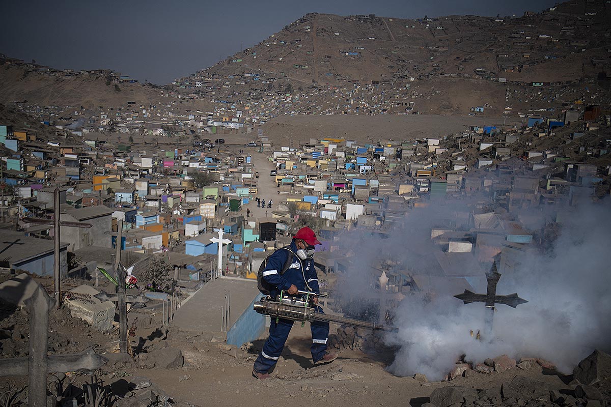 Un empleado municipal fumiga contra el mosquito aedes aegypti, transmisor del dengue, en el cementerio de Lima.