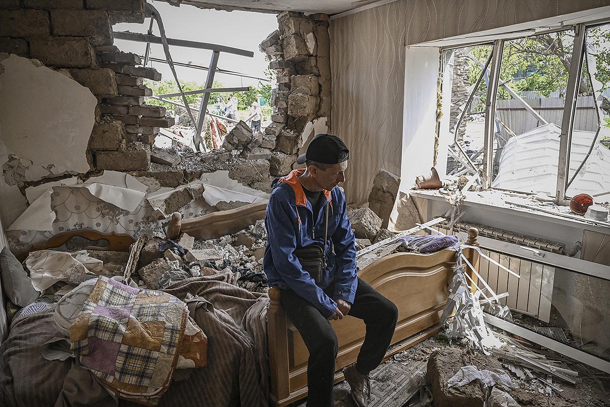 Sergiy Tarasyuk se sienta en la cama de su habitación, luego de un bombardeo aéreo en la ciudad de Sloviansk, en el Este de Ucrania.