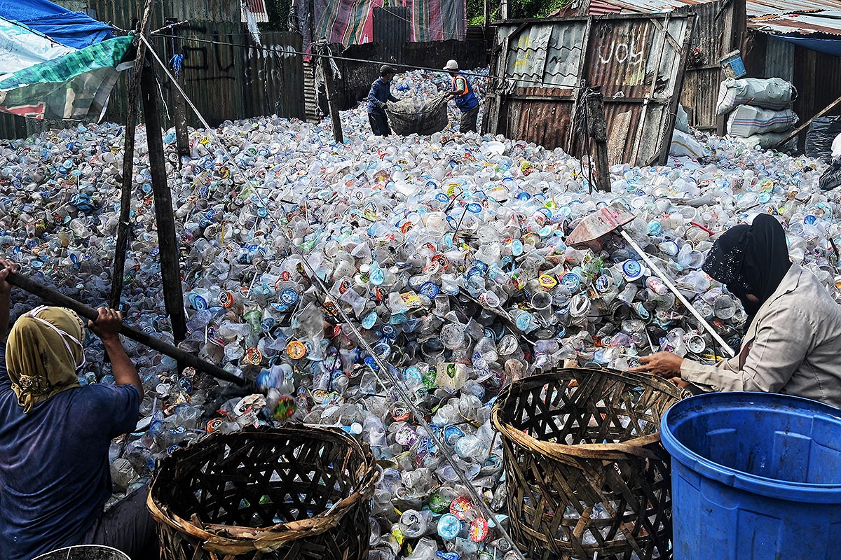 Trabajadores indonesios recolectan botellas de plástico para su reciclado.