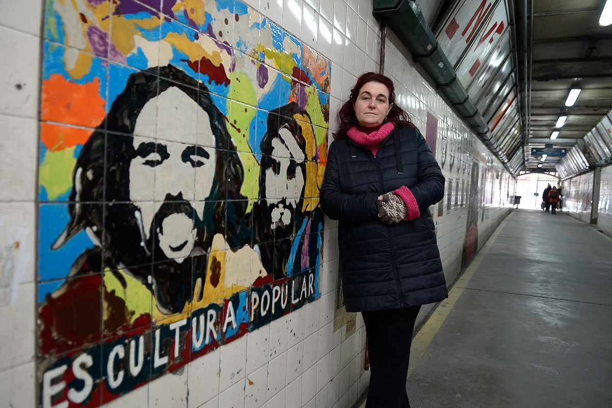Alejandra Andreone es una de las artistas que alimenta el espacio con su trabajo. Resalta que la iniciativa funciona en forma independiente y a puro pulmón. Andreone se acercó en 2005, en la época de los juicios contra Franchiotti y Acosta, los policías condenados a perpetua por los asesinatos. “Creo en la militancia como una perspectiva de vida, para extender las barreras de lo posible. Este espacio amplifica luchas, es una expresión popular auténtica. Un ‘no-lugar’, de paso, que te invita a pensar y a tener memoria, y está vivo, siempre mutando”, dice Alejandra. Una de sus obras, un collage combativo, se puede disfrutar en el hall. Cuando tiene que elegir la pintura que más la moviliza, deja de lado los grandes murales. Se queda con un grupito de azulejos algo descoloridos que tiene un mensaje clarito para los aún impunes responsables políticos de la masacre: “Van a pagar cada lágrima asomada, cada gota derramada de la sangre popular”.