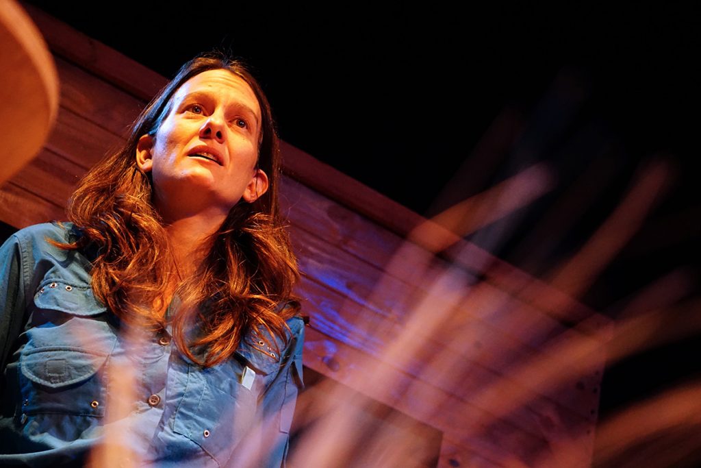 Pero este unipersonal que parece tomar la forma de un soliloquio tiene, también, “un largo camino sinuoso: trabajando la sensación de estar ahí sola en la Patagonia, con el viento y sin nada, ver qué empieza a emerger, cómo se empieza a hiperbolizar lo que sucede a partir de un clima hostil, una casilla de dos por dos en una extensión de tierra sin fin”.