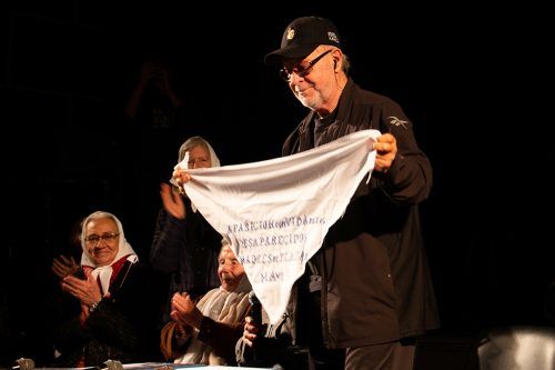 Un Gieco visiblemente conmovido recibió el pañuelo bordado por las propias madres. Estaban junto a él Josefa «Pina» de Fiore, Irene de Chueque, Sara Mrad, Carmen Arias, todas las Madres de la Asociación. También Visitación Folguerias de Loyola quien le dijo: «Yo te llevo siempre en mi pañuelo». El artista luego repasó algunas de sus canciones más bellas. Además expresó: “Se hace un poco difícil seguir. Mercedes siempre me decía: ‘Nene, no llores en el escenario, nunca jamás!». El cariño de los presentes selló un momento único.