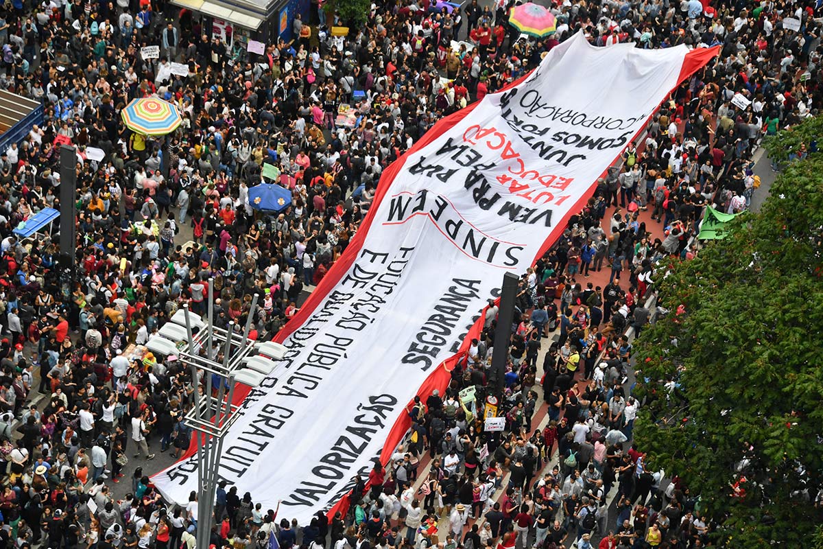 En Sao Paulo, las autoridades cerraron la Avenida Paulista, una de las principales arterias de la capital económica de Brasil, copada por manifestantes en su mayoría jóvenes, animados por una banda musical y coreando consignas como «Saquen las manos de la educación» y «Libros sí, armas no».