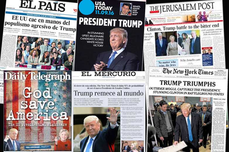 «Trump, un populista con un discurso xenófobo y antisistema, será el próximo presidente de Estados Unidos», escribe el diario El País de España. «Nadie como Trump supo entender el hartazgo con el establishment, con el que se identificaba a Clinton. La ola populista global ha llegado a la Casa Blanca», agrega el diario.
