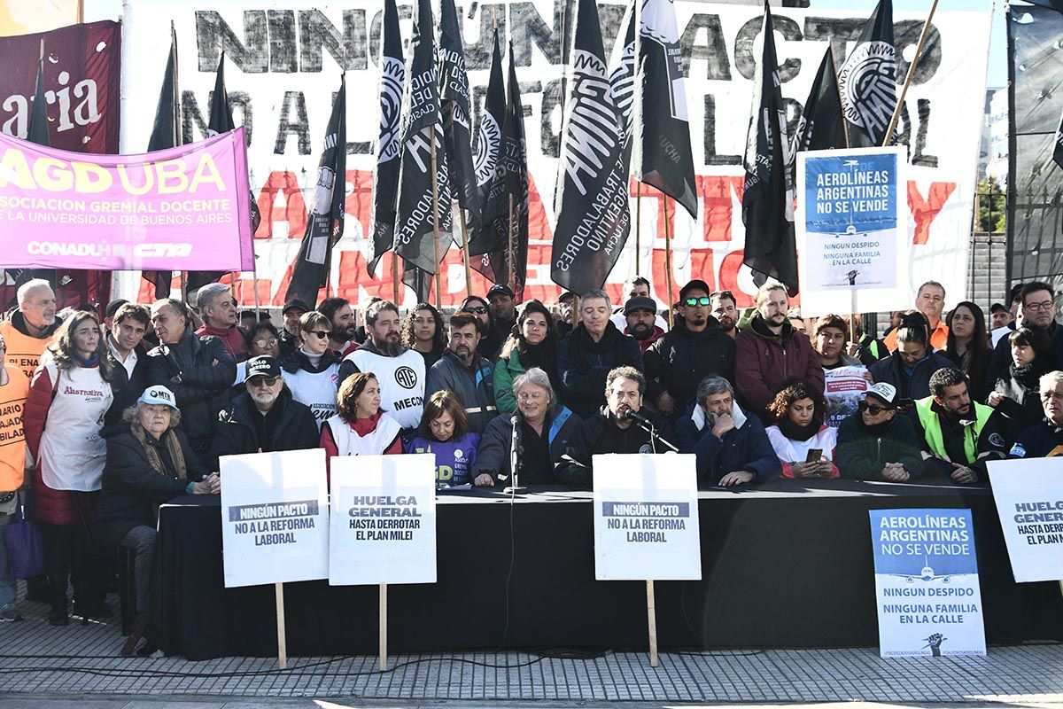 La evaluación de los presentes indicaba que la adhesión a la medida de fuerza resulta contundente y que demuestra que el apoyo al gobierno encabezado por el presidente Javier Milei ya quedó lejos del 50% que mostraron las urnas. El ajuste, evaluaron, resulta intolerable para la mayoría de la clase trabajadora que, por ese motivo, se sumó masivamente al paro general. El blanco de los reclamos estuvo centrado en la ley de Bases que se apresta a tratar el Senado y que, señalaron, implica un retroceso en materia de derechos de la clase trabajadora a nivel de principios del siglo pasado. “Estamos para defender las conquistas que lograron nuestros padres y abuelos”, explicó Alejandro Crespo en la apertura de la conferencia.