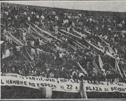 Y fue entonces, a 72 horas de lo que se esperaba que fuera una de las manifestaciones gremiales más grandes desde el golpe de Estado de 1976, cuando la hinchada de River desplegó una bandera en contra de los militares: «Luchar es participar y movilizar. Luche y se van. El hambre no espera. El 22 a Plaza de Perón», decía la tela blanca con letras negras, de 22 metros de largo, colgada minutos antes del partido con Boca en la baranda de la tribuna Almirante Brown alta, hoy Sívori, donde se ubicaba la barra. La leyenda estaba firmada por la CGT y las 62 Organizaciones, otra estructura sindical también ligada al peronismo, el movimiento político al que habían adherido, al menos hasta entonces, varios de los líderes de la hinchada de River. La militancia justicialista del Tano Mingo en los 60, primer jefe del grupo que luego se llamaría Los Borrachos del Tablón, fue continuada por varios integrantes de la barra en los 70: durante la dictadura también desaparecieron algunos integrantes de la hinchada de River.