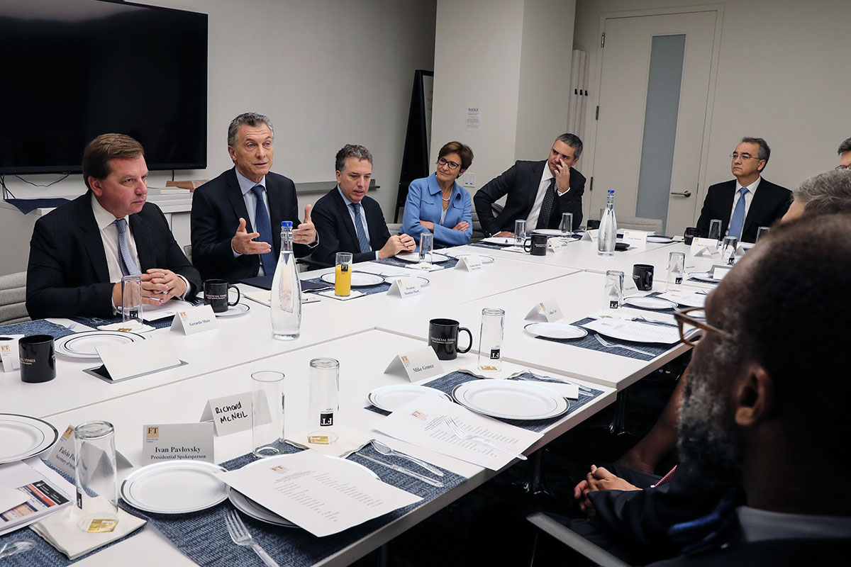 Tan importante es la necesidad de vender la idea de «continuidad» a los mercados, que la primera escala del Presidente fue una reunión en las oficinas neoyorkinas del Financial Times. Llegó acompañado del ministro de Hacienda Nicolás Dujovne, el secretario de Asuntos Estratégicos, Fulvio Pompeo, y el embajador argentino en los Estados Unidos, Fernando Oris de Roa. Del otro lado, escucharon atentos los ejecutivos: Jane Fraser (Citi Bank), Ed Al Hussainy (Columbia Threadneedl), Alberto Ramos (Goldman Sachs), Gerardo Mato (HSBC), Martin Marron (JP Morgan), John Moore (Morgan Stanley), Michael Gómez (PIMCO) y Tom Langford (UBS).