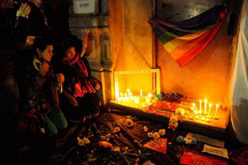 Con cuidado, las mujeres lesbianas que estuvieron al frente de la manifestación movieron las ofrendas en un cantero del edificio.