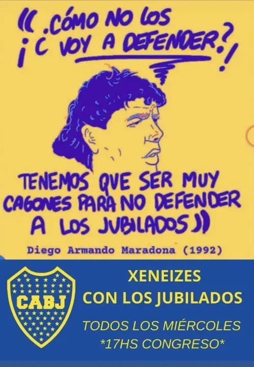 Los hinchas del Xeneize retomaron una mítica frase de Diego Armando Maradona para convocar a la marcha: «Yo defiendo a los jubilados, cómo no los voy a defender. Tenemos que ser muy cagones para no defender a los jubilados”.