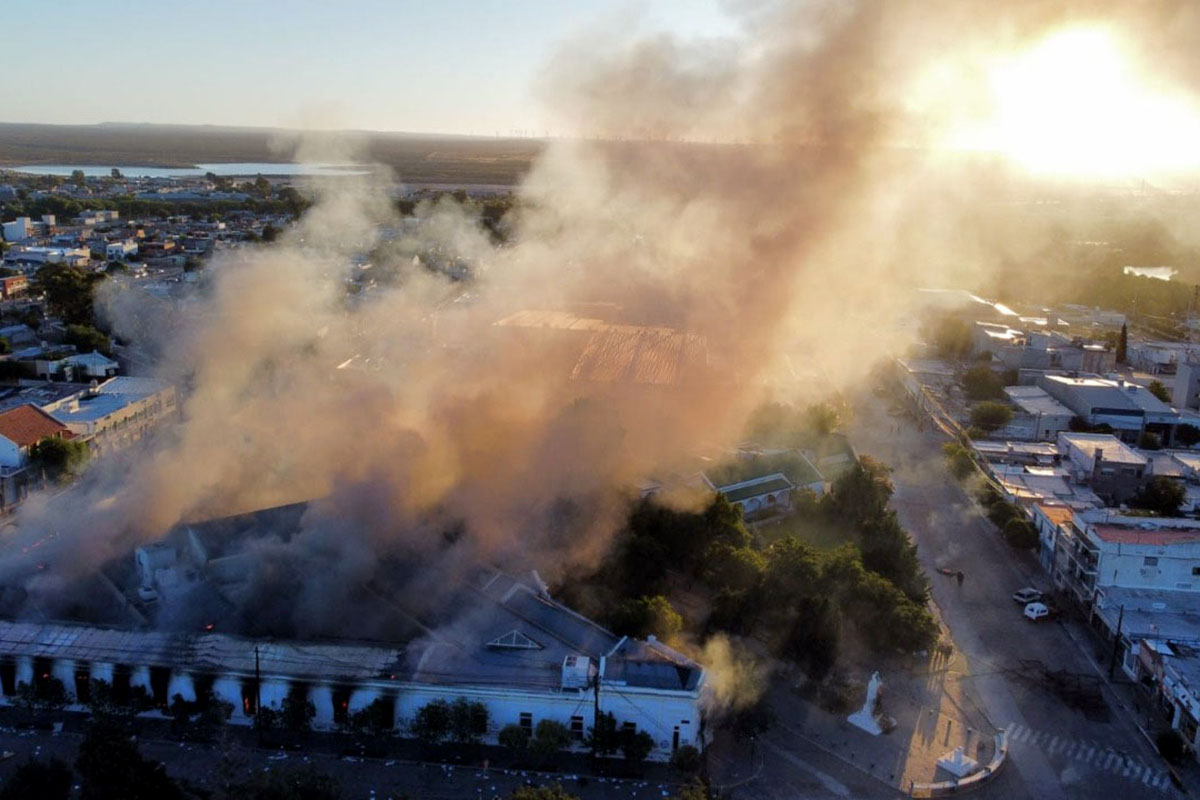 Dotaciones de Bomberos intentaban controlar el incendio en los edificios públicos. Su intervención se demoró porque, según informan medios de Chubut, los voluntarios no tenían las garantías para poder trabajar en medio del violento enfrentamiento entre la Policía y los manifestantes.