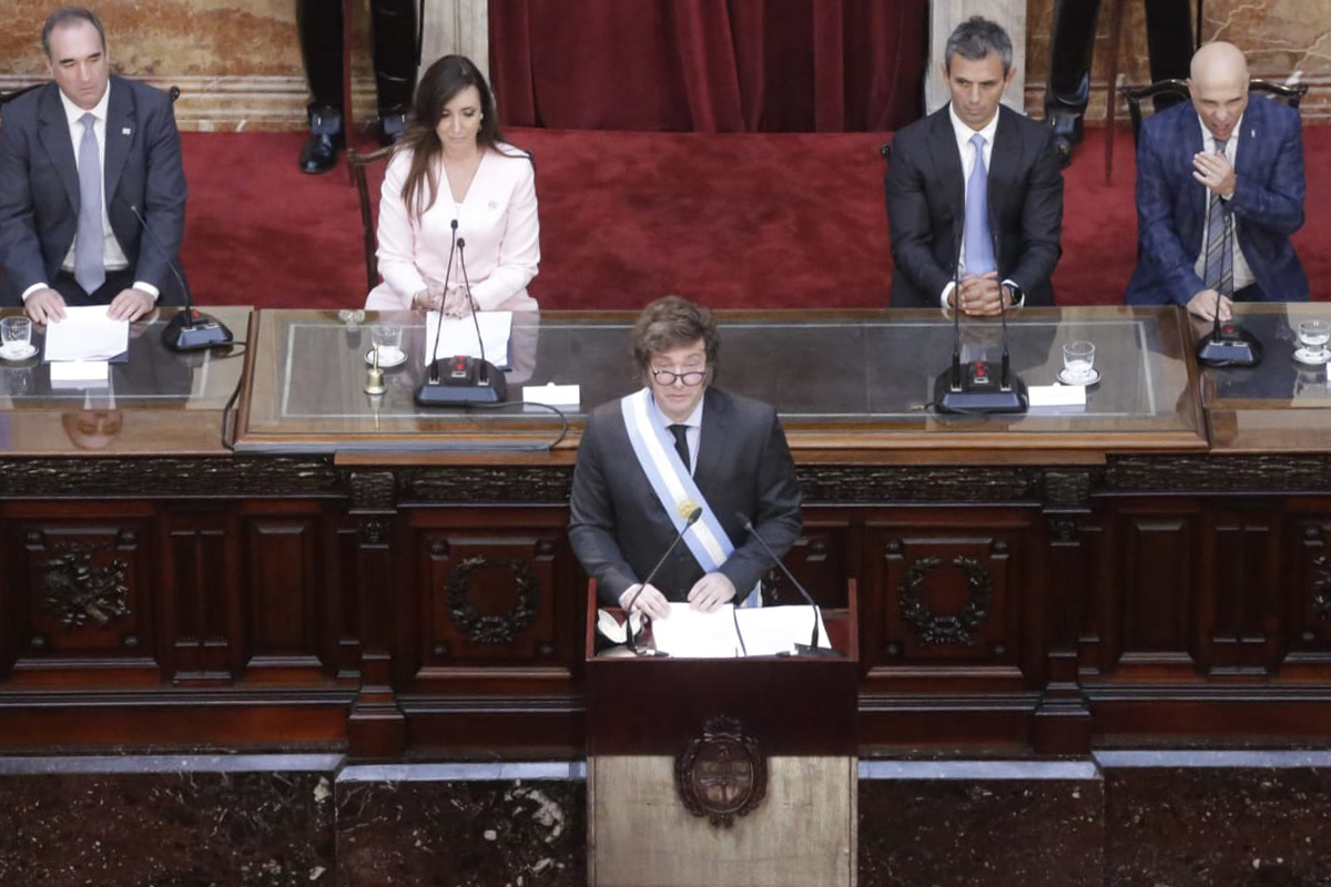 El presidente Javier Milei hizo el recorrido de la Casa Rosada hasta el Congreso Nacional escoltado por un operativo de seguridad que utilizó 5000 efectivos de fuerzas federales, que funcionaron como virtuales vallas humanas a lo largo de la Avenida de Mayo. Entró al recinto con el bastón. Se acomodó en el atril y se puso los lentes para dar el discurso de inauguración de las sesiones ordinarias del Congreso Nacional.