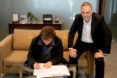 Escoltado por el jefe de Gabinete, Manuel Adorni, el Presidente rubricó el texto que ingresó este jueves por el Senado.