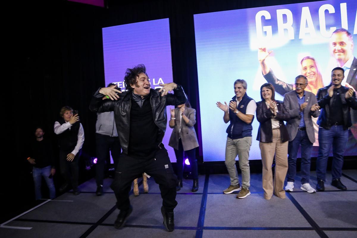 El presidente de la Nación, Javier Milei, festeja los resultadosd e las elecciones legislativas pasadas en el bunker de La Libertad Avanza.