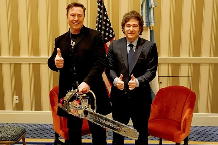 Milei acudió al encuentro de Musk al grito de «amigo» y, según las imágenes distribuidas por Presidencia, le obsequió una motosierra de utilería, con la que ambos se fotografiaron.
