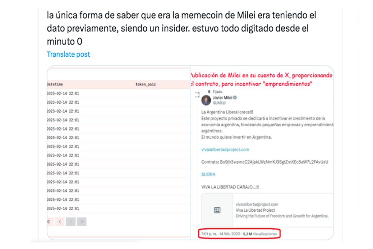 Y completó: «Si quedan dudas miren las fotos: las compras más grandes se hicieron literalmente al mismo momento que Milei sacó el tweet (a los 00 segundos). La única forma de saber que era la memecoin de Milei era teniendo el dato previamente, siendo un insider. Estuvo todo digitado desde el minuto 0«.