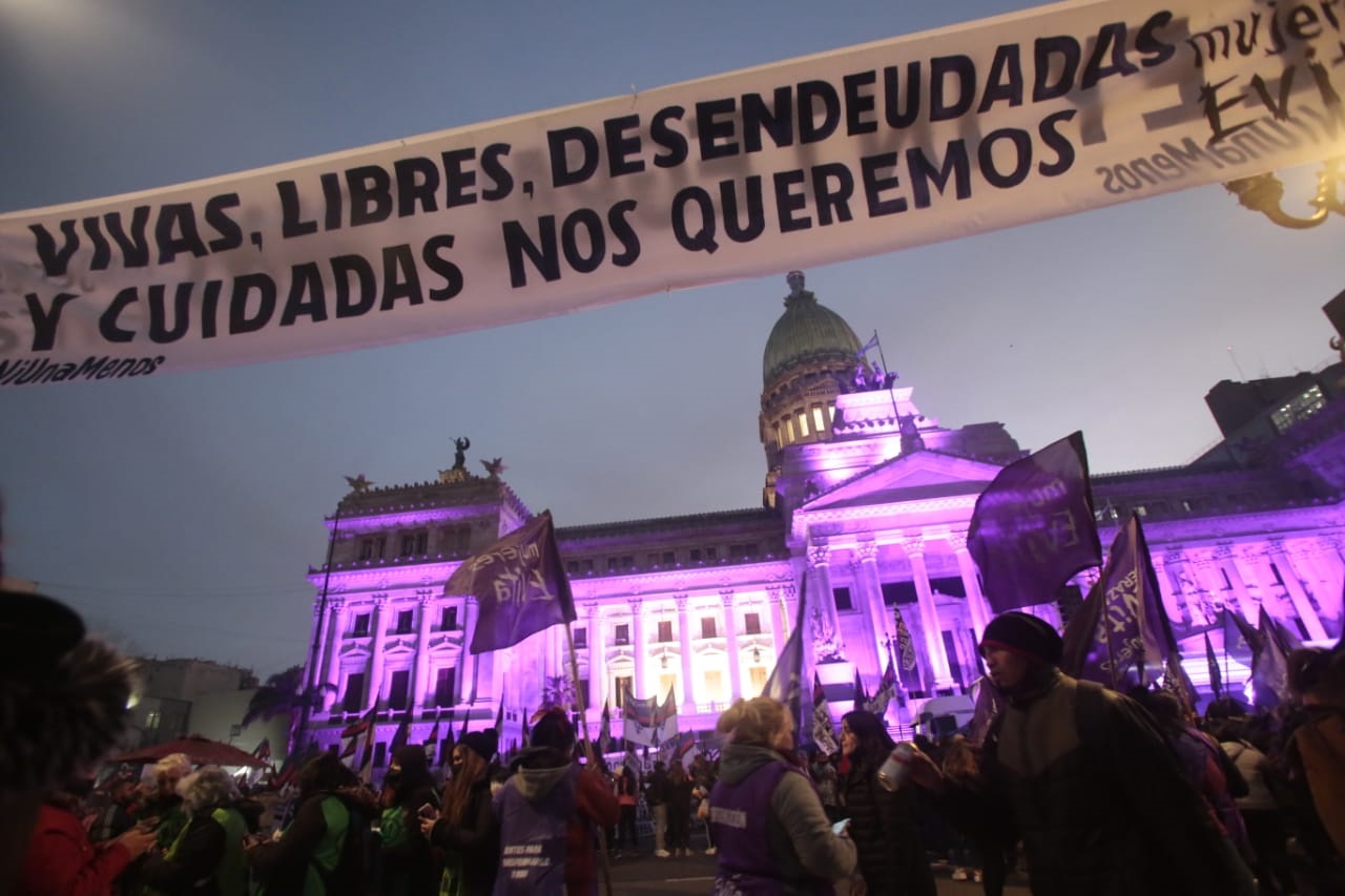 La protesta en Buenos Aires en contra de la violencia machista, que se tiñó de violeta e incluyó bombos e intervenciones musicales y artísticas, se extendió desde el Congreso de la Nación y recorrió Avenida de Mayo hasta la Nueve de Julio.