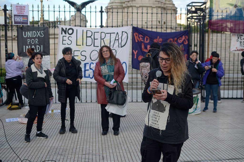 Tras recordar los casos de Tehuel de la Torre, varón trans desparecido en 2021, y Pepa Gaitán, fusilada en 2010 por ser lesbiana, Benjamín, integrante de la Agrupación LGBTI+ 1969, llamó a “no quedarse de brazos cruzados mientras despiden a compañeras trans del Estado nacional, mientras faltan las hormonas (destinadas a las personas trans que llevan adelante terapias de hormonización en el sistema sanitario público), mientras asesinan compañeras que vivían en una situación vulnerable y soportaban día a día el hostigamiento de un tipo educado en este sistema para disciplinar a las diversidades y si te pasás de la raya, ¡pum!”.