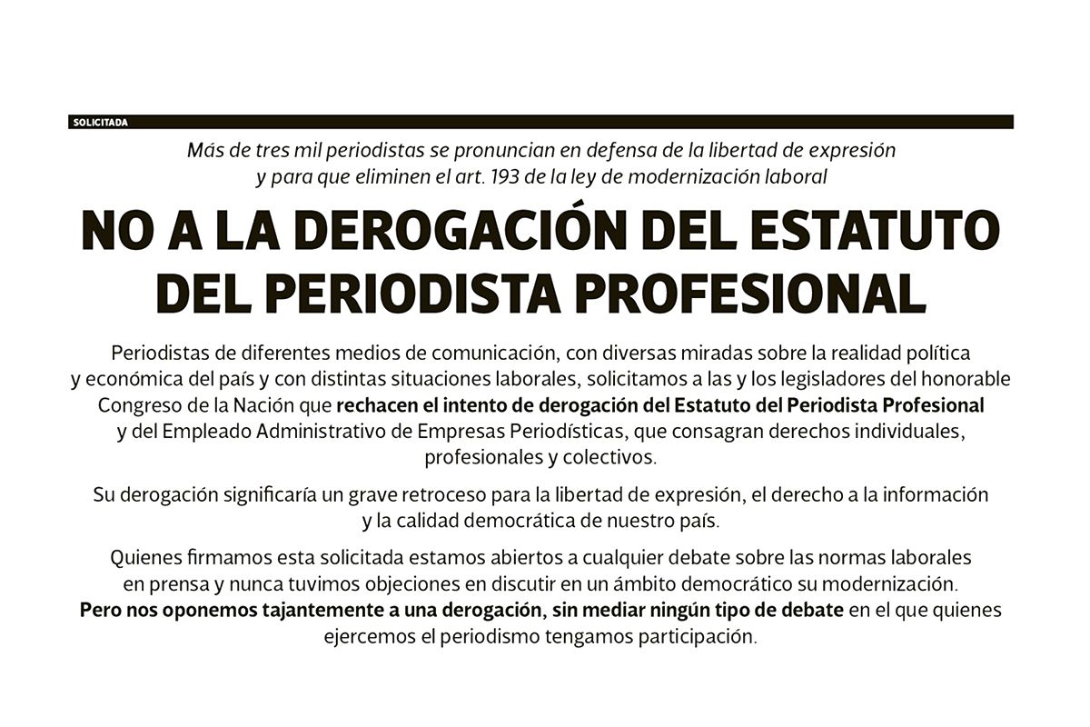 Quienes firmamos esta solicitada estamos abiertos a cualquier debate sobre las normas laborales en prensa y nunca tuvimos objeciones en discutir en un ámbito democrático su modernización. Pero nos oponemos tajantemente a una derogación, sin mediar ningún tipo de debate en el que quienes ejercemos el periodismo tengamos participación.