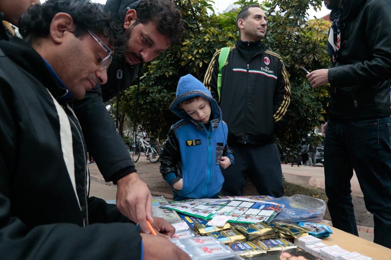 Es un mediodía fulero, frío y con amague de lluvia en Caballito, pero a nadie parece importarle. Chicos, grandes, curtidos coleccionistas y vírgenes aficionados se dan cita religiosamente todos los sábados y domingos, pero en masa en la previa del Mundial para intercambiar las figuritas repetidas, conseguir las difíciles, comprar paquetes en promoción o simplemente compartir esta pasión que, cada cuatro años, nunca se despega demasiado del merchandising oficial de la gesta futbolera globlal, mucho antes y también después de que la pelota empiece a rodar.