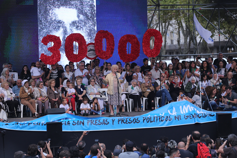 Hace un año en esta misma plaza alertamos sobre el negacionismo impulsado por funcionarios de este gobierno. Venimos a decirles a los negacionistas, una vez más, que los desaparecidos son 30.000 y nos faltan a todos, comenzó el documento que cerró la marcha. En el escenario, la cifra de desaparecidos en color rojo, sobresalía sobre los pañuelos de las Madres y Abuelas, delante de la pantalla que proyectaba la consigna de repudio a la represión, el hambre y la impunidad. Hoy nos convocan a esta plaza los despidos masivos, la miseria planificada, la entrega del país a los buitres, la persecución de los pueblos originarios; la persecución a militantes; las presas y presos políticos; la impunidad para los genocidas, la violencia institucional, la represión a la protesta social, la censura a la prensa; y la defensa de todos los derechos de las mujeres, lesbianas, travestis y trans, resumió el documento.