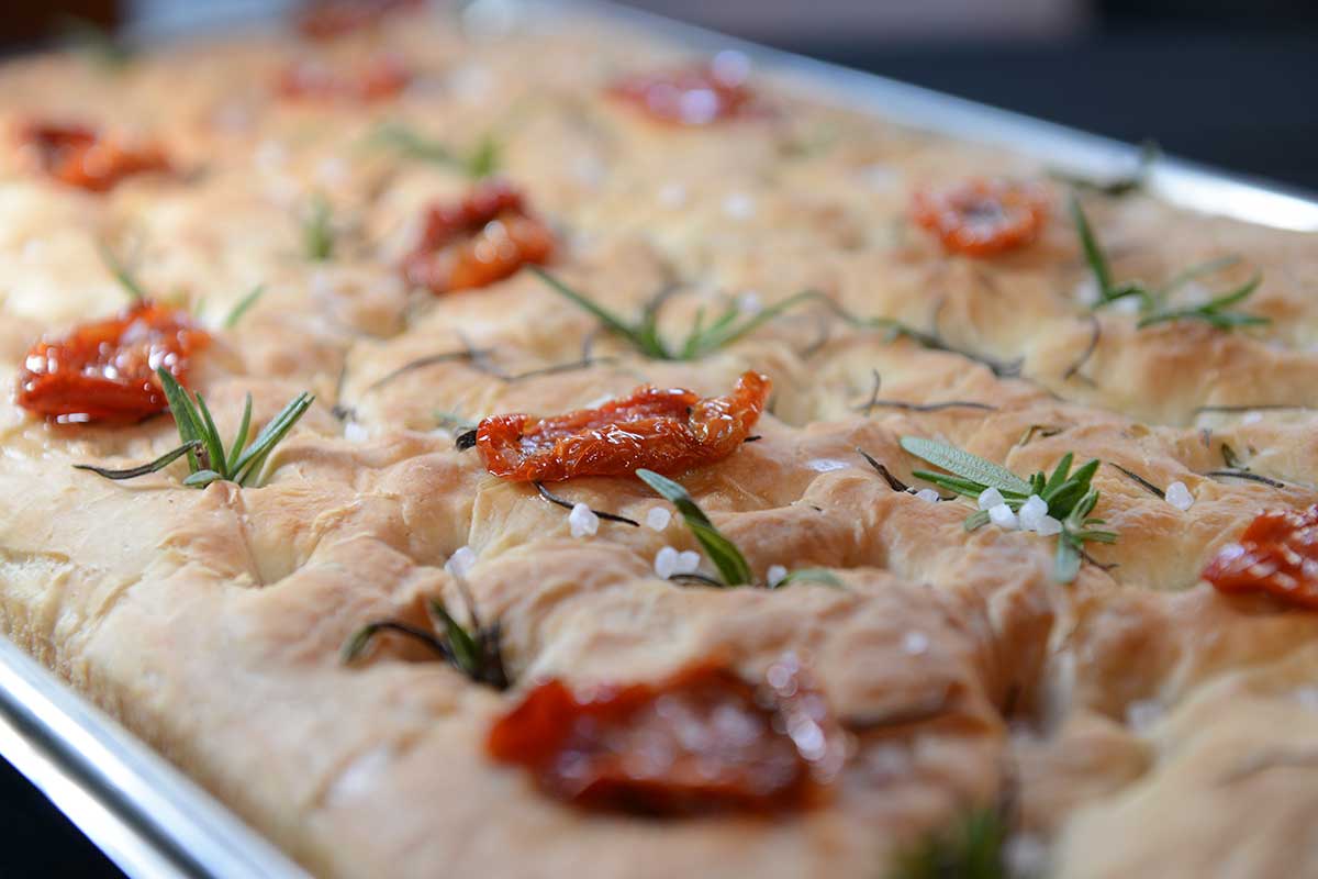 Lleve a una placa, estirar y pinche en todo su contorno el romero fresco restante; deje descansar hasta duplicar su volumen.