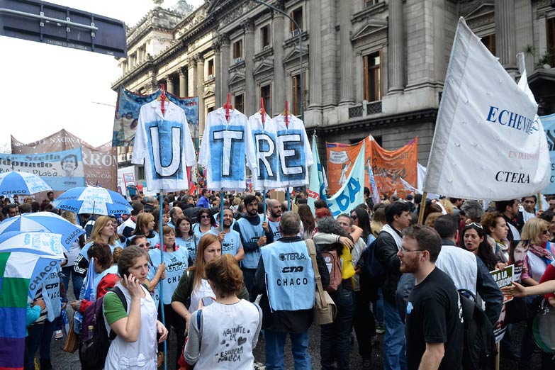 Allí realizaron un acto conjunto maestros y docentes referenciados en UTE, la Asociación de Enseñanza Media y Superior (Ademys) y el Sindicato Argentino de Docentes Privados (Sadop) en rechazo a la oferta salarial del 21,5 por ciento y a las reformas en la escuela secundaria, entre otros puntos. Son los 2 únicos gremios de docentes porteños, de un total de 17, que no aceptaron la oferta.