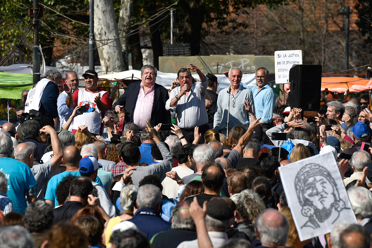 En medio del fervor, los abrazos y saludos entre viejos conocidos se multiplicaron por decenas. Los bailes al ritmo de la cumbia invadieron el relajado barrio de Caballito. Pasadas las 12:30, rodeados de acompañantes y alentados por una multitud, Juan Ramos Padilla y Jorge Rachid se subieron a la tarima para saludar y agradecer a los convocados que se acercaron para mostrar su descontento hacia una “corte canalla, corrupta y criminal”. En el último mayo pasado ambos encabezaron una movilización similar frente al Palacio de Justicia en un acto que contó con el apoyo de la CGT, la CTA, organismos de Derechos Humanos y movimientos sociales. Sin embargo, ninguno de los nombrados se sumaron a este nuevo reclamo.