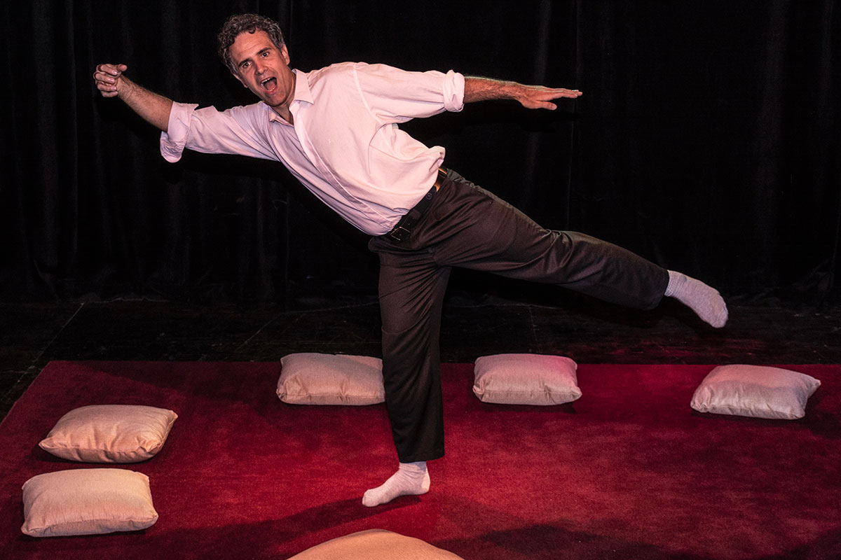 La pregunta se proyecta en todas las historias que atraviesa Deviniendo Tato, en una escenografía prácticamente despojada, con siete almohadones en el piso y la presencia de Maximiliano Sarramone, el único actor en escena. La obra alterna entre la representación de una sesión de psicodrama y la ruptura de la cuarta pared, con interpelaciones directas al público. En un gran despliegue actoral, Sarramone interpreta a Tato y a siete pacientes. Los personajes comparten miedos, angustias, tensiones entre sí, y hasta situaciones absurdas, como la anécdota de una pareja que adelgaza al esquivar caca en la calle.