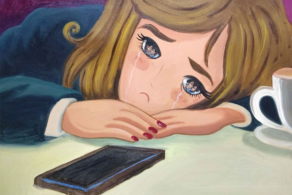 La artista responde a sus cuestionamientos a través de los tópicos que trabaja en El desvelo de Eros: “En esa pintura con una chica recostada en el piso, ella está con un celular en la mano y aparecen un montón de caras flotando en el espacio. Son todos los perfiles que mira en una app de citas: caras que vienen, caras que se alejan, caras que quedan más difuminadas. Es como verme a mí misma: ¿A dónde van a parar las caras de toda esa gente con la que alguna vez hablé? ¿Las conversaciones que quedaron en el aire? Me alucina poder ver en un solo plano esta situación cotidiana que es como una metarealidad”.