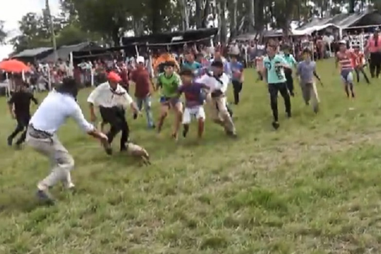 El chancho enjabonado se basa en untar al animal con algún producto que resulte resbaladizo, lanzarlo a un predio y rebuscárselas para atraparlo. El que lo captura es el ganador. En Asoreva subrayaron que «consiste en correr y atrapar un pequeño cerdito absolutamente enjabonado con detergente para que luego una horda de niños se abalance sobre el pobre animal sometiéndolo a golpes, aplastamiento, asfixia, miedo, estrés, pero básicamente tortura”. La otra prueba consiste en correr a una gallina en un corral, que «también infringe la Ley Nacional 14.346 de protección a los animales la cual prohíbe expresamente todo acto donde se hiera u hostilice a los animales”.