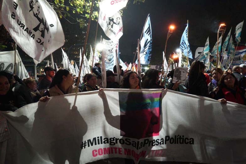 La marcha había sido convocada por el Frente por el Trabajo y Dignidad Milagro Sala, una coordinadora de agrupaciones en la que tiene un rol central la propia Organización Territorial Túpac Amaru, que encabeza la dirigente jujeña presa en el penal de Alto Comedero. Entre las antorchas encendidas se vieron, además, banderas de La Cámpora, ATE Capital, Solidaridad e Igualdad, Los Irrompibles, Sindicato de Curtidores de Cuero, Quebracho, CTA de los Trabajadores, Movimiento Territorial de Liberación (MTL), Descamisados, Militancia Popular y PCCE, entre otros espacios políticos y sindicales.