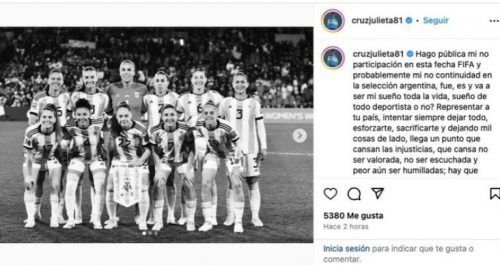 Cruz, defensora, escribió en sus redes sociales: «Representar a tu país, intentar dejar todo siempre, esforzarse y sacrificarse, dejando mil cosas de lado. Llega un punto que te cansan las injusticias, cansa no ser valorada, no ser escuchada y aún peor, ser humillada. Espero que generaciones futuras no pasen por esto y puedan finalmente disfrutar de la Selección. Les deseo lo mejor».