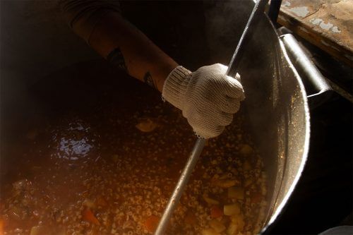 En las cocinas se produce la magia. A las ocho de la mañana llueve, truene o salga el sol las ollas comienzan a llenarse con lo que las cocineras puedan reunir. Dos acciones, entre tantas, son la que más fotografiamos los reporteros gráficos: el acto de revolver y el de repartir, reunir lo posible y conjurar para que alcance. Los brazos que revuelven y reparten son casi siempre femeninos o feminizados.