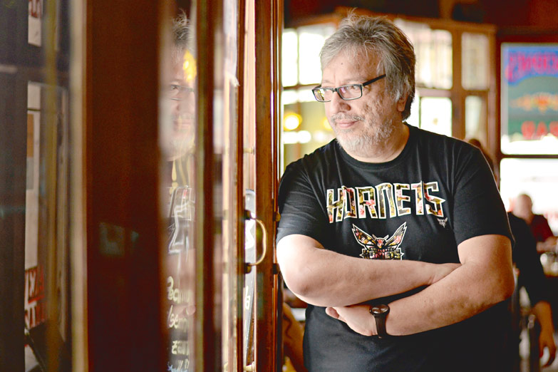 En los ’90 Sergio Olguín fundó, junto con Karina Galperín y Pedro Rey, V de Vian, una revista «casi de literatura». Luego se incorporó otra gente como Claudio Zeiger, Elvio Gandolfo, Cristian Kupchik. De las muchas cosas que le quedaron de esa experiencia, figura el seudónimo con el que firmaba sus artículos provocadores, Luis Pazos. Este alter ego literario que ya aparecía en Lanús migró a Filo, una novela de 2003 que acaba de reeditarse por Alfaguara. En ella se desarrollan dos historias que corren paralelas hasta que, desafiando los postulados de la geometría euclidiana, las historias paralelas terminan por cruzarse. Una de ellas tiene como escenario casi exclusivo la Facultad de Filosofía y Letras y sus bares cercanos. La otra está referida a un hombre, Simone, que pierde su trabajo y que intentando disimular su estado de desocupado ante su famiiaconoce a un ladrón, Pajarito, un punga de poca monta con el que termina formando una pequeña sociedad, una pyme delictiva. El punto de encuentro entre una historia y otra es la hija de Simone, Marcela, estudiante de Letras a la que en un acto de amor paternal Simone le regala la primera edición de Ficciones, un texto borgeano de incalculable valor en el mercado que, ignorante de ese hecho, Simone se llevó en una de sus incursiones de ladrón. Olguín dice que entendió que en Filo, Luis Pazos tenía que parecerse más al periodista corrosivo que él fue en V de Vian.