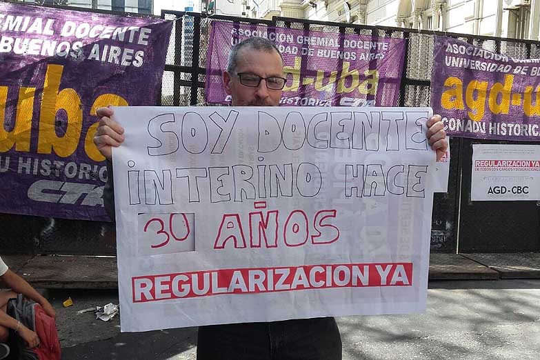 En la puerta del rectorado varios docentes se fotografiaban con un cartel que señalaba la cantidad de años que vienen ejerciendo su cargo de manera interina. Legítimamente consideran que el solo ejercicio de su labor durante un período tan prolongado de tiempo, con renovaciones anuales, da muestra de su idoneidad. Además, desconfían de la transparencia de los concursos que preparan las autoridades.