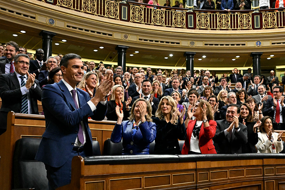 «Su saludo en la Cámara Baja de las Cortes Generales estuvo cargado de simbolismo. Lo mismo que su discurso, pesado en acusaciones y en desarrollo ideológico. Pedro Sánchez Pérez-Castejón, madrileño de Tetuán, de 51 años, socialista empedernido, líder indiscutido del PSOE, lograba un esforzado 179-171 para su tercera investidura, con la que podría llegar a nueve años de gobierno consecutivo. Expuso mucho más que un programa, justificó los intrincados acuerdos con catalanes, vascos y gallegos de variopintas ideologías y no se abstuvo de apuntar a la España de derecha y ultraderecha. Hasta mencionó a Milei (ver recuadro).