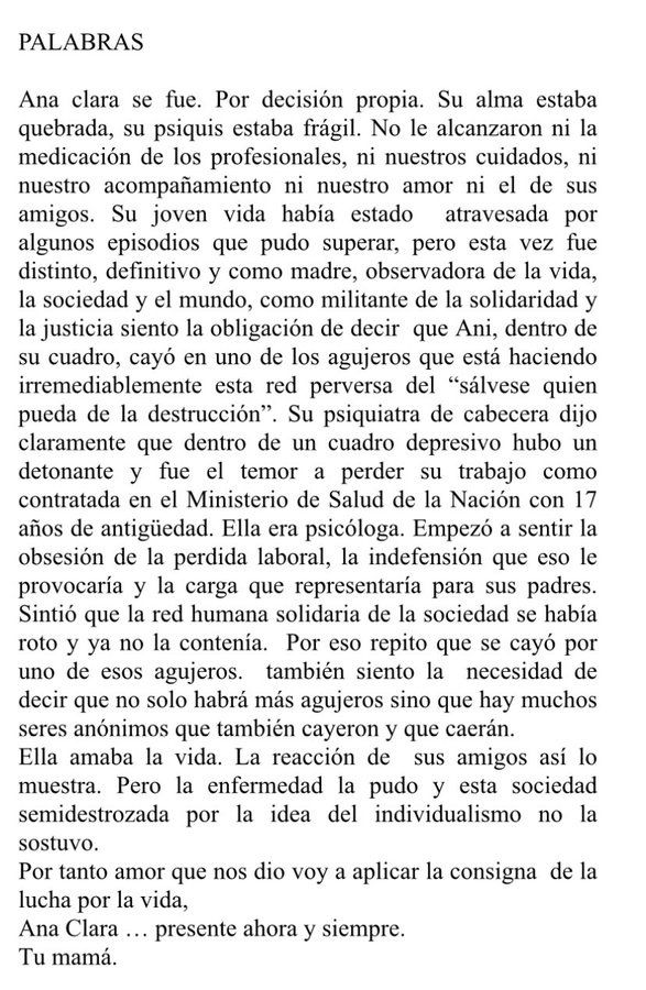 “Su psiquiatra de cabecera dijo claramente que dentro de dentro de un cuadro depresivo hubo un detonante y fue el temor a perder el trabajo como contratada del Ministerio de Salud de la Nación con 17 años de antigüedad”, escribió la madre de Ana Clara.