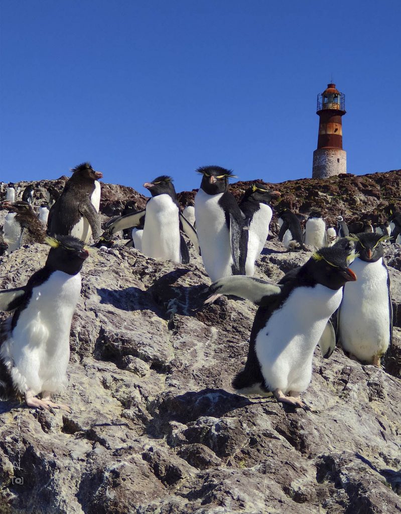 En forma lenta y en silencio se avanza por un sendero demarcado con rocas redondas para no interceder entre los pingüinos de Magallanes, sus nidos y su propio camino de ir y regresar del mar, en esta planicie y playa con la que se distingue una de las caras de la isla. Mientras que al avanzar, siempre se ve el faro y detrás de él, un cañadón de roca, entre color anaranjado, ocre y blancuzca por el guano de cientos de años y allí verá a los saltos al pingüino de penacho amarillo. Protéjase de los Skúas, unas aves marino costeras que lo atacarán a toda velocidad, también defendiendo sus nidos con huevos de color naranja.