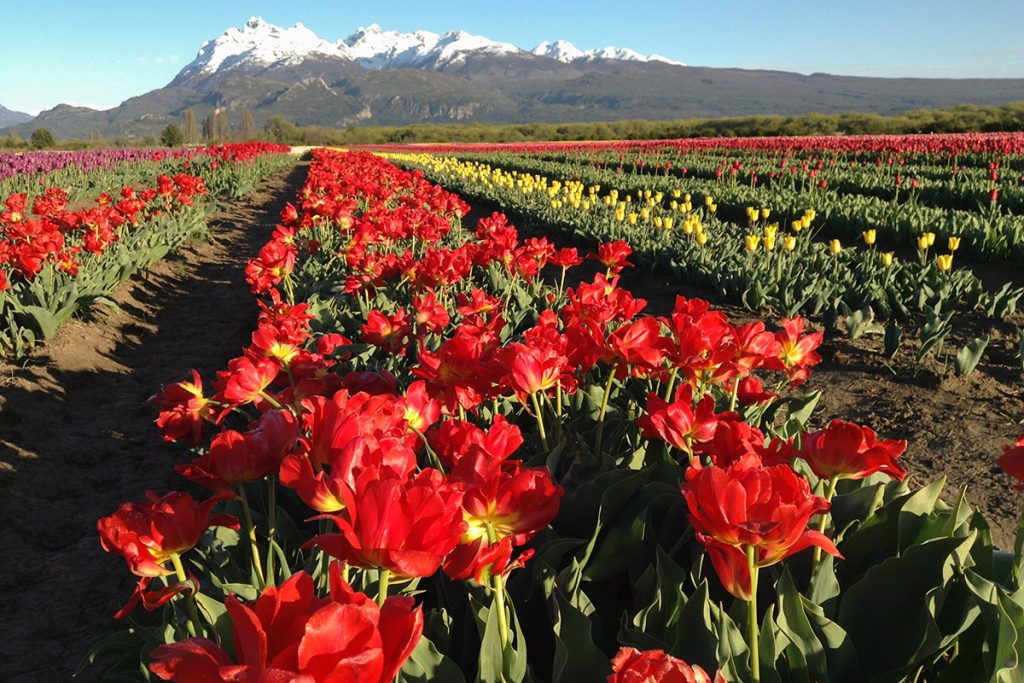Hay que ir y verlos. Contemplarlos. Escucharlos. Sentirlos. Porque las casi 30 variedades que florecen en el campo Tulipanes de Patagonia cada mes de octubre, están a pleno. Son hileras de 400 metros de colores que se unen en el horizonte recortado por las montañas nevadas y el cielo inmensamente claro. Un infinito al alcance de la mano.